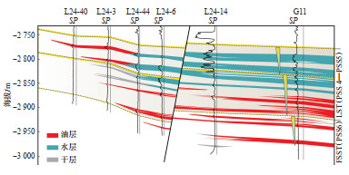 在三级层序格架的约束下,以体系域为单元开展准层序或砂层组的划分,能够有效指导砂体对比和油气开发。基于岩性变化和自然伽马曲线特征,将该段划分为6个准层序(PSS1—PSS6),对应6个砂层组。其中,准层序PSS6对应FSST,准层序PSS2—PSS5对应LST,准层序PSS1对应TST。油藏剖面表明,PSS4—PSS6内部砂体表现出连续进积的趋势(图 9)。LST中PSS4—PSS5砂体厚度和推进距离明显大于PPS6,油层发育特征与砂体发育特征基本一致,其规模和特征主要受层序格架的控制。早期PSS6—PSS5油藏主要受砂体上倾尖灭控制,晚期PSS4油藏则受砂体和断层共同控制,断层与砂体匹配关系良好。综上所述,不同尺度的层序分析可以有效指导储层预测与砂体精细对比,同时也是研究油藏特征的重要工具。