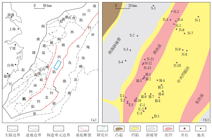 1 地质概况东海陆架盆地位于欧亚板块东部,处于印度—澳大利亚板块、西伯利亚板块、太平洋板块和菲律宾板块的夹持之中,属于弧后陆缘裂谷盆地[14-16]。西湖凹陷位于东海陆架盆地东部坳陷带中部,面积为4.6×104 km2,凹陷内堆积有大于15 km厚的新生代硅质碎屑沉积(图 1a),极具研究价值与勘探潜力[17-18]。黄岩地区位于西湖凹陷中南部,由中央凹陷区和西次洼组成,是西湖凹陷稳定的沉积洼陷之一(图 1b)。