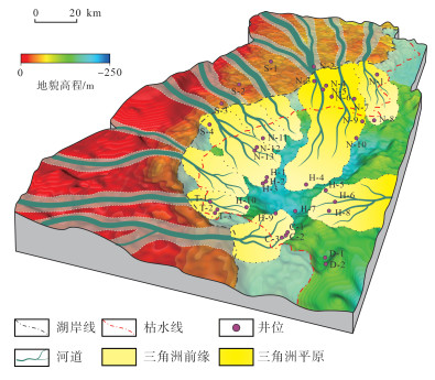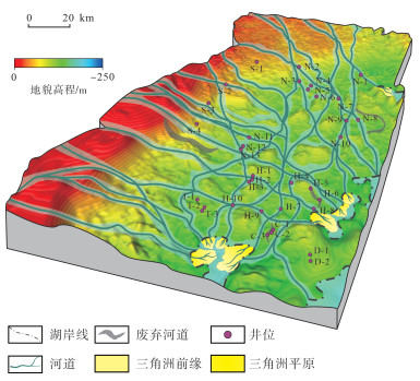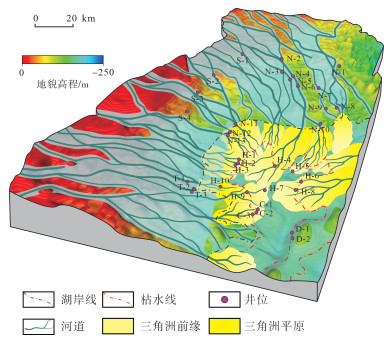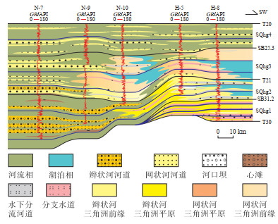 (2)平水期(SQhg3沉积时期),研究区呈平水缓坡型水深-地貌格局,湖盆边界坡度小于2°。该时期湖泊范围中等,沉积范围减小,沉积物经网状河河道长距离搬运后沉积,砂体表现为席状连片发育(图 10)。河控主体区主要发育网状河,河道出现弯曲化,弯曲化程度增大,出现分支状水系,剖面上表现为单向横流,水道下切程度增大,河网密集,但单支河道规模较小。河湖交互区发育席状连片砂体,孤立朵叶特征不明显,虽然水位与SQhg1沉积时期相比深度下降,但总体具有一定规模的水体,因而导致三角洲前缘叠覆在湖岸坡带上,沉积特征表现为大平原小前缘,整体上表现为相对富砂,其中H-1井含砂率为48.4%,N-13井含砂率为31.9%,H-4井含砂率为50.7%,N-5井含砂率为70.3%。