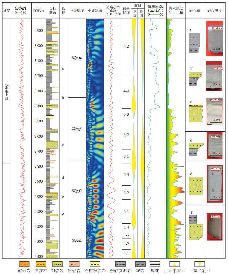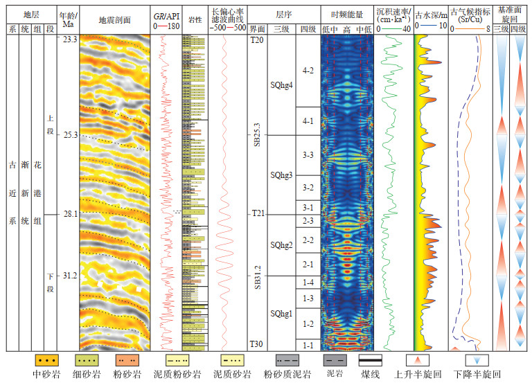 基于自然伽马测井数据与钻井岩性序列,使用R软件“astrochron”程序,利用频谱分析、天文调谐等方法对东海陆架盆地西湖凹陷黄岩地区花港组沉积地层进行米兰科维奇天文旋回识别。通过Matlab一维连续小波变换工具箱进行小波分析,并进行井-震结合对比校验,将研究区花港组划分为4个三级层序、12个四级层序(图 2)。花港组自下而上可识别出T30,SB31.2,T21,SB25.3及T20等三级层序界面,在三级层序内部的四级沉积基准面或水退界面,通常表现为岩性或岩性组合的分异界面,为砂岩底界面。