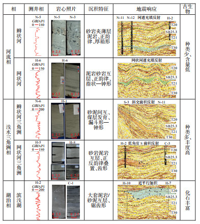 湖控主体区水深在洪水期大于6.8 m、平水期大于5.5 m、枯水期大于4.0 m,岩性以泥岩夹极薄粉砂岩为主,不含砾石,含砂率低(小于30%)。该区单层砂体厚度小于3 m,为湖泥和席状砂,具有明显反韵律特征,泥岩多以灰黑色泥岩为主,测井曲线多为高频齿状。岩心特征表现为块状、无明显粒度变化,地震响应特征为高连续,中强振幅,平行—亚平行反射(表 1)。