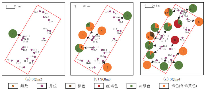 结合钻、录井及岩心等资料,统计东海陆架盆地西湖凹陷黄岩地区花港组三级层序发育时期的杂色(非灰黑色)泥岩可知,SQhg1—SQhg4沉积时期,杂色泥岩数量增多且北部亮色泥岩较南部更为发育,指示了研究区水深逐渐变浅的趋势且南部水深大于北部(图 4)。