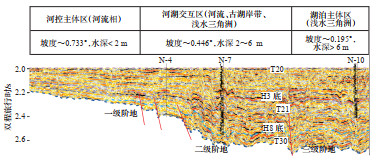 3.4 河湖交互沉积单元平面特征受早期平湖组断裂的控制,研究区斜坡至洼陷发育多级坡折体系,不同坡折带之间对应不同的沉积单元。依据地震识别坡折点可在研究区识别出3级阶地,同时可选取坡度与水深对各级阶地进一步表征。其中,一级阶地对应河控主体区,坡度较陡,约为0.733°,水深小于2 m,距离物源区较近,以河流相为主,发育厚层含砾砂岩,地震相表现为低频弱振幅特征;二级阶地对应河湖交互区,坡度约为0.446°,坡度变缓,水深为2~6 m,发育河流和浅水三角洲交互沉积,发育厚层砂岩,泥质夹层增多,地震相表现为中低频、中弱振幅,以隐性前积、叠瓦状前积为主;三级阶地对应湖控主体区,坡度约为0.195°,坡度更缓,发育在沉积古地貌中低洼且平坦的位置,水深大于6 m,以浅水三角洲沉积为主,稳定泥岩段增多,地震相表现为中高频、中强振幅(图 7)。