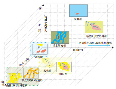 沉积相带发育特征是可容空间和不同水体波动共同作用的结果,即物源体系与河流运载能力控制着砂体的总量和规模;地形地貌控制着砂体的展布;湖岸线和水深控制着砂体的厚度和范围[5, 7, 22-24]。东海陆架盆地西湖凹陷黄岩地区花港组沉积时期随水深增大沉积相逐步由河流相过渡为三角洲相再到浅湖相,而地形坡度则不然,随坡度增加依次发育河流相和浅水三角洲相,湖泊相则发育于坡度有限的洼陷。亚相—微相也具有类似相关性,随水深增大逐渐发育河道—河口坝—席状砂—远砂坝—浅湖泥序列,坡度则不尽然,河口坝、席状砂需一定坡度条件,其他微相则发育于缓坡背景(图 8)。