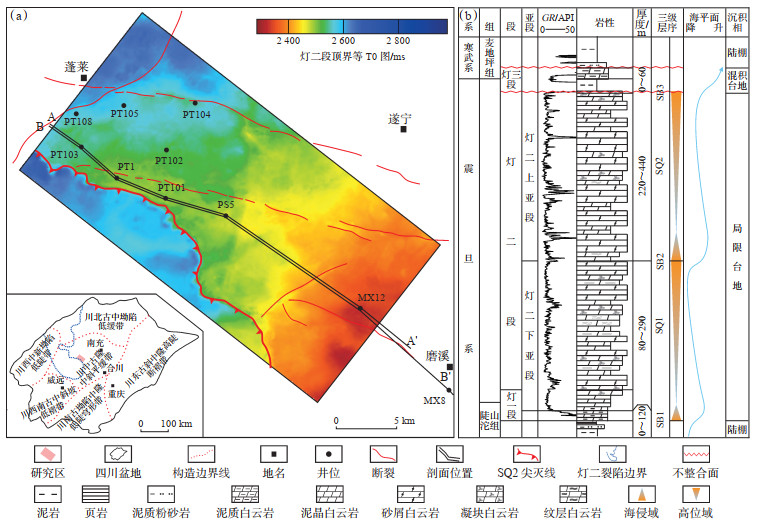 1 地质概况蓬莱地区位于四川盆地中北部,构造上隶属川中古隆中斜平缓构造带北部,处于四川省遂宁市安居区、资阳市乐至县、蓬莱镇与磨溪镇之间(图 1a)。研究区域为磨溪—蓬莱三维连片地震覆盖区,三维地震资料为SEG零相位正极性数据,主频为26 Hz,有效频宽为8~60 Hz,面积约800 km2,该区共9口井钻遇灯二段。
