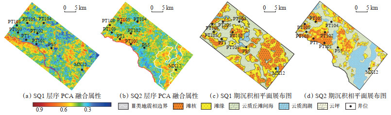 经过数据归一化处理后,利用PCA得到SQ2融合属性切片(图 10a)。将融合属性值与井点处丘滩地比交会后,相关性有明显提高,相关系数为0.930(图 9p)。此外,融合属性图所反映的微相分布边界更加清晰,微相平面分布更符合区域沉积背景,其结果更能反映目的层丘滩体分布的实际情况。经上述分析流程,对SQ1层序进行多属性分析,并获取融合属性切片(图 10b)。