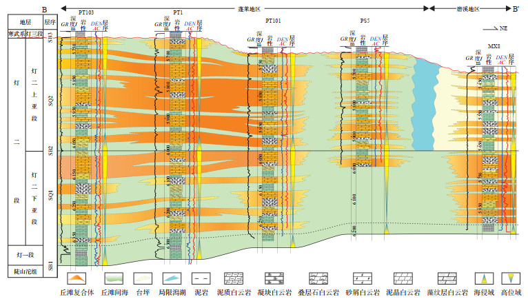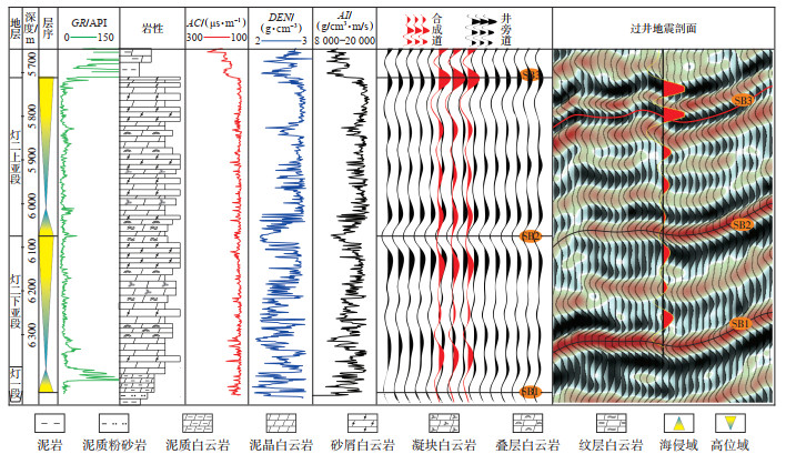 SB2界面对应灯二段上亚段底界面,为典型的Ⅱ型层序界面,界面之下为砂屑白云岩,微生物凝块白云岩等,界面之上通常表现为快速海侵形成的泥晶白云岩或泥质白云岩。GR曲线由箱状低值向微齿状低值过渡,具有明显上下分段特征,上部GR具有多期旋回特征,下部总体箱状。该界面对应地震波谷,局部区域可借助分频地震资料辅助追踪。