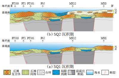 通过对研究区北西—南东向连井剖面(图 11)进行沉积相对比分析发现,该区灯影组灯二段主要发育局限台地相,以发育丘滩复合体为特征。受控早期地貌分异,MX8井区SQ1沉积期原始地貌较高,丘滩单期沉积规模稳定,纵向厚度为40~50 m;而蓬莱地区SQ1沉积期丘滩发育程度明显弱于磨溪地区,丘滩发育规模相对小,单期纵向厚度为10~20 m,横向连续性较差,丘滩间海的发育范围更大。至SQ2沉积期,蓬莱地区单期丘滩体发育规模变大,纵向厚度为60~70 m,横向连续性好;磨溪地区SQ2沉积期整体表现为台坪沉积,丘滩发育明显较蓬莱地区差,单期发育规模小,厚度为10~20 m。同时在蓬莱和磨溪地区之间发育岩性致密带(局限潟湖)。