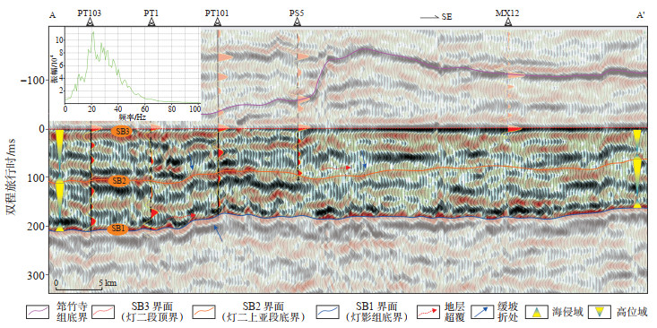 2 层序地层格架建立等时地层格架是地震沉积学分析的前提,精细的地震层位解释是建立等时地层格架的关键。有学者以中上扬子地区为研究对象,认为灯影组可划分为4个三级层序,其中灯一段+灯二段对应2个三级层序(SQ1,SQ2);灯三段+灯四段对应2个三级层序(SQ3,SQ4)[29-30]。在以往研究基础框架上,运用Vail经典层序地层学原理,综合电性、岩性、储集层等特征,井-震结合对灯一段+灯二段进行整体考虑与解译,识别出灯一段底界面(SB1界面,Ⅱ型)、灯二段下亚段与上亚段界面(SB2界面,Ⅱ型)及灯二段顶界面(SB3界面,Ⅰ型)3个三级层序界面。