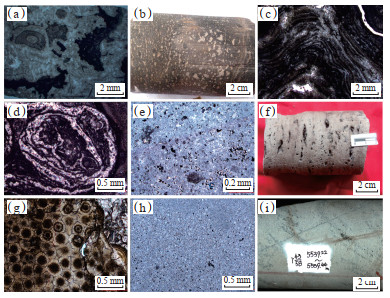 下载原图 图 4 四川盆地蓬莱地区震旦系灯影组SQ1和SQ2层序典型岩石学宏微观特征 (a)凝块白云岩,微生物丘,洞穴被粗大白云石半充填,少量残留孔,局部发育核形石,PT101井,5 733.00 m;(b)凝块白云岩,微生物丘,PT1井,5 756.36~5 756.54 m,岩心;(c)叠层石白云岩,微生物丘,PS5井,5 697.42 m;(d)核形石白云岩,微生物丘,PT103井,6 102.03 m;(e)砂屑白云岩,颗粒滩,PT103井,5 714.44 m,灯二段;(f)砂屑白云岩,颗粒滩,PT1井,5 728.72~5 728.85 m,顺层溶洞发育,岩心;(g)鲕粒白云岩,颗粒滩,PS5井,5 666.30 m,灯二段;(h)泥晶白云岩,丘滩间海,孔隙不发育,PT103井,5 716.50 m;(i)泥晶白云岩,台坪,MX132井,5 539.22~5 539.44 m,岩心。 Fig. 4 Typical petrological macro-micro characteristics of the Sinian Dengying Formation SQ1 and SQ2 in Penglai area, Sichuan Basin |