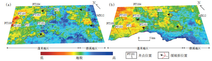 4 地震沉积学特征 4.1 地震地貌分析蓬莱地区灯二段整体属于碳酸盐岩台地沉积[31],丘滩复合体在海平面升降、古地貌等因素的控制影响下在该区频繁生长叠置、迁移。由于缺少指示水深的地震相标志,常规的地震地貌学手段所获得沉积体平面几何形态等信息多是不同类型沉积体叠置过后的综合响应,难以准确地恢复研究区古地貌特征。因此,层序地层格架约束下的经典印模法(cast)和残厚法(isopach)仍是古地貌恢复的有效手段[21]。使用印模法逐一恢复SQ1和SQ2沉积期古地貌特征及演化过程。古地貌恢复结果(图 5)表明,研究区整体继承了“隆凹”格局的沉积特征,SQ1沉积期地貌隆凹分异明显,整体呈南东高、北西低,向北西方向倾覆的特征,磨溪地区较蓬莱地区地貌整体较高,PS5井一线及MX12井一线呈南东—北西走向的局部地貌高带。SQ2沉积期古地貌对SQ1沉积期有一定继承性,整体仍表现为南东高、北西低的特征;地貌高带有向北西迁移的趋势,在PT101井—PT102井—PT104井东侧一线和MX12井西侧一线呈南东—北西走向的2条地貌高带,其中,西侧地貌高带整体低于东侧地貌高带,形成“两隆三凹”的古地貌特征。同时,研究区局部的微地貌高差控制了坡折带的形成,坡折带类型为沉积型缓坡折,控制着丘滩复合体的沉积分异(参见图 3,图 5)。