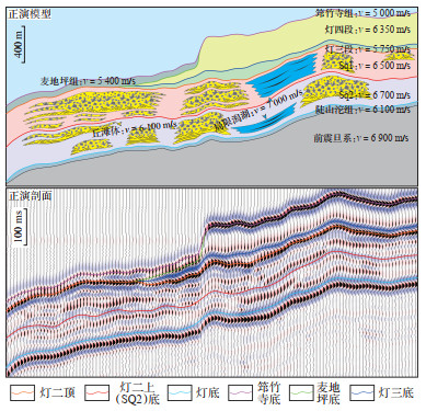 为了进一步明确研究区地震相与沉积相对应关系,从实钻测井资料拾取地层及沉积体的理论厚度与速度参数值,建立了该区层序格架内丘滩复合体发育的理论地质模型,采用射线追踪方法,选择主频为26 Hz的零相位正极性雷克子波进行激发模拟(图 6)。正演结果显示,丘滩复合体发育时,在正演地震剖面上表现为低幅丘状外形结构,内部杂乱或断续—弱断续反射、内幕核部亮点反射特征。丘滩间海表现为平行—亚平行中频中等振幅特征,局限潟湖相则表现为席状平行强反射、中低频强振幅反射特征,与实际井-震标定结果保持一致。