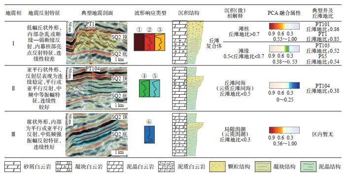 根据研究区SQ2和SQ1的PCA融合属性预测结果,利用单井控制,综合沉积期古地貌、波形聚类平面分布以及实钻井资料,对该区沉积相带进行预测。平面上,按照单井丘滩地比和相对发育关系,可进一步识别出滩核、滩缘、云质丘滩间海、云坪、云质潟湖5种沉积微相。滩核和滩缘均位于Ⅰ类地震相带:滩核微相(PT101井和PT1井)单井丘滩地比> 0.7,融合属性值为0.53~1.00,按照融合属性展布趋势逐步包络丘滩地比> 0.7的单井,恢复滩核微相的展布范围;滩缘微相单井丘滩地比为0.5~0.7,融合属性值为0.38~0.53,按照融合属性展布趋势逐步圈定0.5 < 丘滩地比 < 0.7的单井范围,定为滩缘微相。云质丘滩间海微相位于Ⅱ类地震相带,单井丘滩地比 < 0.5,融合属性值为0~0.38,按照融合属性展布趋势逐步包络丘滩地比 < 0.5的单井,预测云质丘滩间海的展布范围。云质潟湖微相位于Ⅲ类地震相带,区内无井钻遇,融合属性值大于0.56,按照融合属性展布趋势和地震相边界,结合实际剖面特征,预测云质潟湖的展布范围。研究区云坪仅在SQ2层序中发育,位于Ⅱ类地震相带内,受地貌分异影响,发育在云质潟湖相区东部的磨溪地区。针对未有单井约束的地区,应综合周缘单井丘滩地比变化规律、地貌和地震相展布情况及已有单井丘滩地比与融合属性对应关系,进而预测区内沉积微相发育情况。