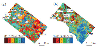 4.2.2 地震相分析波形聚类是岩性识别和沉积相(地震相)常用的分析工具之一[34]。其原理是通过提取所开时窗内地震道的波形特征与邻近时窗进行对比,利用神经网络或模糊聚类等算法,通过不断地特征提取、学习、分类及分析对地震波形进行归类,从而得到不同波形组合在平面上的展布规律。结合地震相分析,对全区三维地震资料进行波形分类,分类时窗设为SQ1和SQ层序地层格架内,利用波形聚类技术得到研究区各层序地震相平面分布特征图(图 8)。通过观察地震相平面图上的不同颜色分布范围,再根据波形特征,对不同类型的波形赋予不同的颜色,类比每一口井与地震相对应关系,从而了解地震相所解释区域的分布。其中,①—③类波形代表Ⅰ类地震相,即丘滩复合体对应地震相;④类、⑤类波形代表Ⅱ类地震相,即丘滩间海和台坪对应地震相;⑥类波形代表Ⅲ类地震相,即局限潟湖对应地震相。从图 8中可以看出,研究区代表丘滩复合体反射模式的地震相发育广泛分布,在SQ1层序中主要分布于东部的磨溪地区,SQ2层序中则主要发育于PT1井—PT101井区。代表局限潟湖反射模式的地震相在SQ1层序中仅在PT102井和PT108井区周缘少量发育,SQ2层序中则主要发育在PS5井以东、MX12以西部分区域。