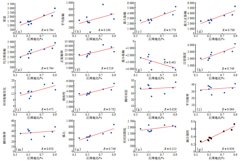 以研究区SQ2层序顶、底界面为约束,从三维地震数据中提取灯影组SQ2层间地震属性,所提取的地震属性主要包括振幅类、频率类、相位类以及波形结构类等15种地震属性。将各地震属性与井点丘滩地比进行交会分析,相关系数R为0.029~0.794(图 9a—9o),R越高表明该属性敏感度越高。