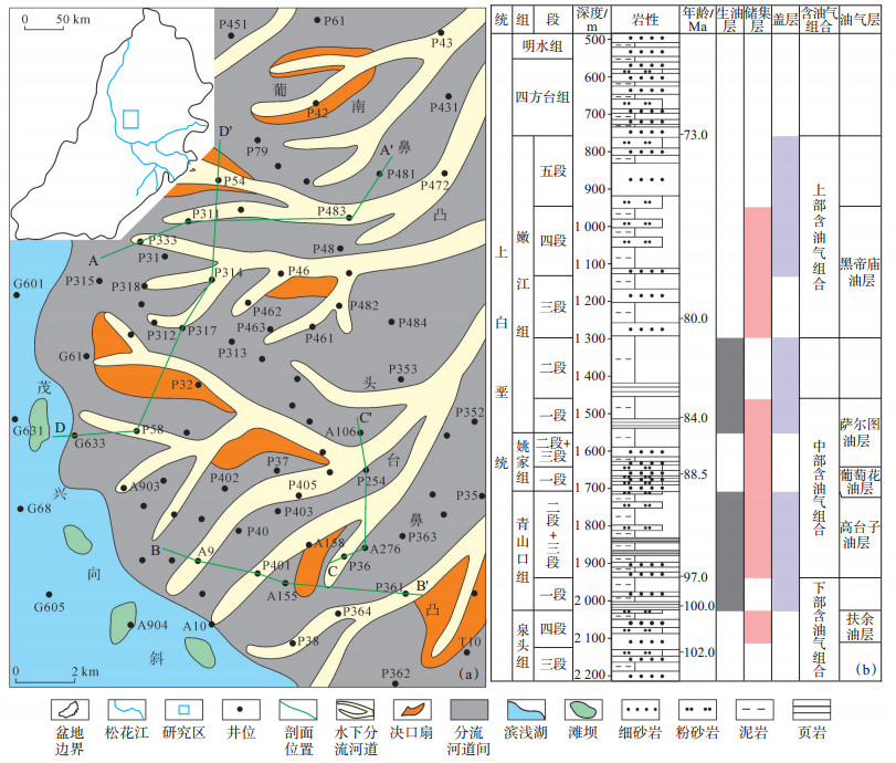 下载原图 图 1 松辽盆地北部葡萄花油田白垩系泉四段沉积相图(a)及岩性地层综合柱状图(b) Fig. 1 Sedimentary facies of the 4th member of Quantou Formation in Putaohua Oilfield(a)and comprehensive stratigraphic column of Cretaceous(b), northern Songliao Basin |