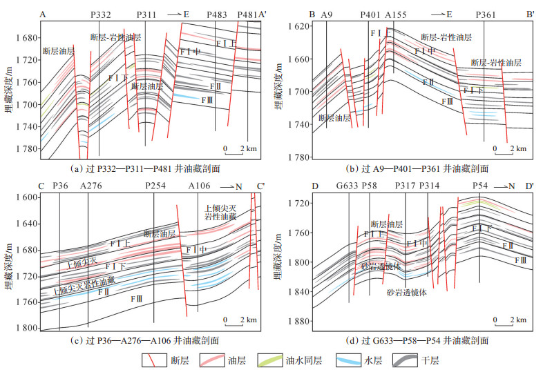 葡萄花油田发育断层圈闭、断层-岩性圈闭、上倾尖灭岩性圈闭和透镜体岩性圈闭等4种,根据圈闭和储层条件,将致密油分为4种类型。区内断层极发育,将分流河道砂体切割成断阶、断块和地垒,并在上倾方向遮挡形成断层圈闭,由于紧邻油源断层且封闭性较好,该区断层圈闭的含油性普遍较好,平面上断层圈闭含油面积受断层及其组合关系控制,如P311井、P46井,是主要的致密油藏类型(图 10a)。断层-岩性油藏是油气沿断层向下进入砂体后,上倾方向因岩性突变或物性封闭形成的,油藏规模受断层、岩性双重控制(图 10b),不同断层-岩性油藏间产能差异大。茂兴向斜向葡南鼻凸、头台鼻凸坡过渡时,沿地层上倾方向因砂体尖灭或渗透性变差形成的上倾尖灭油藏也是该区重要的油藏类型(图 10c),油藏展布受砂体与不同级别的构造间配置关系影响,常见多个韵律层组成的复合砂体上倾尖灭线与斜坡带构造等高线相交,形成大型上倾尖灭岩性油藏,如P36井、A276井。透镜体型油藏是透镜体状、不规则状砂体被四周不渗透泥岩或低渗透砂岩围限形成,受较好物性砂体控制、油藏规模较小,如P58井、A901井(图 10d)。