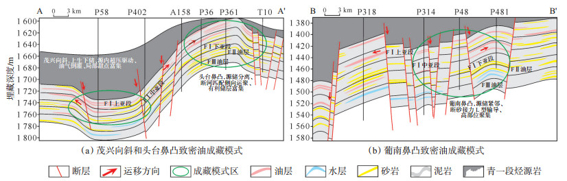 葡南鼻凸成藏模式以P48井、P481井最为典型。该区紧邻古龙生烃中心、运移距离较短、油源条件较好,且三角洲前缘水下分流河道发育,水下分流河道延伸至茂兴向斜、侧向连通性好,河道砂体被Ⅰ类断层切割,组成L型输导体是致密油重要的运移通道,油气在超压和浮力作用下沿陡倾断层与河道砂体,向高部位的有利储层运移(图 11b),在靠近L型立体通道的断层、断层-岩性圈闭聚集,形成断层油藏、断层-岩性油藏。致密油分布受油源断层、河道砂体和构造高点控制,含油面积连续、油藏规模大。