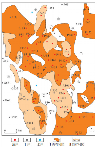 4 有利勘探方向在储层预测的基础上,结合试油和油气显示情况,将葡萄花油田划分为Ⅰ类、Ⅱ类2种有利区,Ⅰ类有利区孔隙度大于10.00%、L型输导通道发育、压力系数大于1.2;Ⅱ类有利区孔隙度为5%~10%、L型输导通道发育、压力系数为0.9~1.2。茂兴向斜以Ⅱ类有利区为主,位于油源断层附近的“甜点”储层是有利勘探目标,如P58,A901井区;葡南鼻凸以Ⅰ类有利区为主(图 12),也是研究区最有利勘探区,位于运移路径上的断层圈闭、断层-岩性圈闭是致密油勘探有利目标,如P333,P54等井区;头台鼻凸以Ⅱ类有利区为主,如P363井、P361井,而当河道砂体只有与断层匹配,形成L型输导通道时,能形成断层-岩性油藏,为Ⅰ类有利区,如南部高部位P364和P362井区。