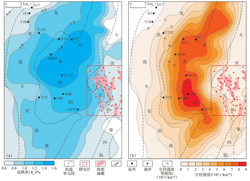 葡萄花油田泉四段致密油主要来自古龙凹陷青一段的半深湖—深湖相烃源岩,该套烃源岩埋藏深度为1 800~2 200 m,厚度为45~85 m,179块样品测试结果表明,其有机质丰度高,TOC值为1.06%~8.93%,深凹区TOC值更是普遍大于3.00%,平均为3.28%,氯仿沥青“A”为0.12%~1.45%,平均为0.42%,属于好—很好烃源;Ro一般大于1.20%,处于大量生油的成熟阶段,高成熟的优质烃源岩生烃强度为(400~800)×104 t/km2,其中凹陷西南部生烃强度大于700×104 t/km2,最高可达963×104 t/km2。葡萄花油田上覆青一段烃源岩埋藏深度为1 200~1 600 m,Ro为0.6%~1.0%,处于低成熟—成熟阶段,生烃强度普遍小于100×104 t/km2(图 2)。葡萄花油田紧邻古龙凹陷南部生烃中心,青一段高成熟烃源岩生成的油气沿断层、砂体等输导通道,自古龙凹陷向位于东部高部位的葡萄花油田运移,不仅为泉四段致密油提供了充足的油源,也从宏观上控制了致密油的分布[14],已发现的油藏均紧邻生烃中心,呈环带状分布。
