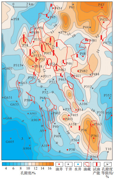 平面上,油藏受孔隙度大于10%的有利储层控制明显。葡南鼻凸埋藏浅、储层物性最好,孔隙度为10%~18%,有利储层连续,油藏呈大面积、连续分布,且试油产能与储层物性呈正相关关系,孔隙度大于12%的井,如P333,P311和P31井试油产能普遍大于8.00 t/d,最大可达19.24 t/d(图 3)。头台鼻凸埋藏深度较大、物性次之,孔隙度为8%~12%,有利储层面积较小,油气分布零散,大部分油井孔隙度大于10%,仅P363井—P361井砂体连续、物性好,含油面积较连续。茂兴向斜埋藏深度较大、物性差,有利储层不发育,孔隙度普遍小于8%,仅少数钻遇优质储层的井产能较高,如P58,A9和A10井。