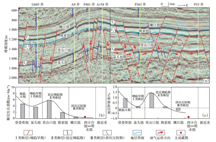 9个地震平衡剖面统计结果表明,泉头组沉积末期,松辽盆地进入整体沉降的坳陷盆地发育阶段,地层伸展率为0.27%~0.32%,强烈的构造活动形成坳陷早期断层(Ⅰ类),自泉头组向上断穿至青一段,此时断层生长指数为3.5~3.9 m/Ma(图 4b)。青山口组沉积时期,地层伸展率达到1.34%~1.49%,在青一段内部形成稳定坳陷期断层(Ⅱ类),断层生长指数也达到5.5~6.2 m/Ma,该区断层数量多、密度大,自青一段向下延伸至泉四段、泉三段,是该区主要的油源断层。嫩江组沉积时期,坳陷盆地结束并进入反转阶段,地层伸展率为-0.36%~-0.42%(图 4c),形成的挤压反转期断层(Ⅲ类)局限于嫩江组、姚家组,该类断层活动较弱,生长指数为0.7~0.9 m/Ma;该时期,受盆地挤压反转作用影响,Ⅰ类断层在嫩江组、四方台组沉积时期再次开启,略早于明水组沉积末期的主成藏期,青一段内部的Ⅱ类断层也开启,致使青一段油气向下倒灌,二者共同组成致密油重要的运移通道[19-20]。