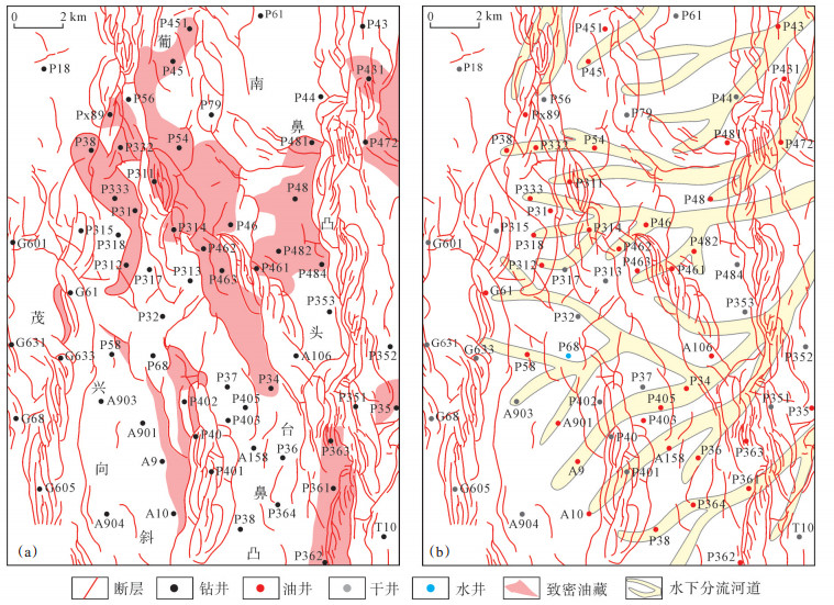 原油沿断层倒灌进入泉四段致密砂岩后,在浮力的作用下沿延伸入湖的水下分流河道砂体,向上倾方向侧向运移,在近源的正向构造、斜坡区等油气运、聚低势区聚集,如P46,P54,P461,P484与P361等高产油井均位于断层+河道组成的L型输导通道附近,而P79,P313,P484和P402等井虽然靠近断层,但远离水下分流河道砂体,L型输导通道不发育,其试油结果均为干井(图 5b),进一步表明,断层+河道匹配形成的L型高效运移通道,是影响研究区致密油成藏的重要因素。