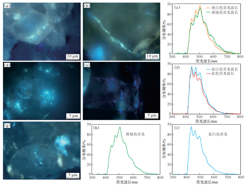 下载原图 图 6 松辽盆地北部葡萄花油田白垩系泉四段含烃流体包裹体荧光特征 (a)含烃盐水包裹体发黄白色荧光,P431井,1 732 m;(b)含烃盐水包裹体发黄绿色荧光,P431井,1 732 m;(c)荧光波长,P431井,1 732 m;(d)含烃盐水包裹体发蓝白色荧光,P48井,1 842 m;(e)含烃盐水包裹体发蓝色荧光,P48井,1 846 m;(f)荧光波长,P48井,1 846 m;(g)含烃盐水包裹体发黄绿色和蓝白色荧光,P312井,1 765 m;(h)黄绿色荧光波长,P312井,1 765 m;(i)蓝白色荧光波长,P312井,1 765 m。 Fig. 6 Fluorescence characteristic of hydrocarbon containing fluid inclusion of the 4th member of Cretaceous Quantou Formation in Putaohua Oilfield, northern Songliao Basin |