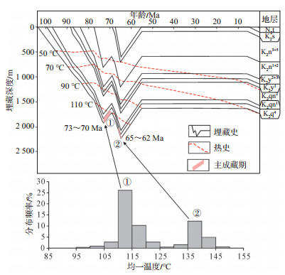 通过Y88井埋藏史-热演化史模拟结果(图 7)表明,青一段烃源岩沉积后被快速埋藏,在姚家组沉积末期埋藏深度大于1 200 m,地层温度约90 ℃,达到低成熟阶段;嫩江组沉积末期埋藏深度约1 800 m,地层温度大于110 ℃,达到成熟阶段开始生烃,此后由于地层小幅度抬升,生烃过程中止;明水组沉积时期,随着盆地强烈下陷,青一段埋藏深度迅速增大并大于2 000 m,达到生烃高峰,但随盆地挤压反转、地层抬升,青一段烃源岩也在四方台组沉积末期终止生烃。整体而言,青一段生烃过程自嫩江组沉积末期一直持续到明水组、四方台组,存在嫩江组末(73~70 Ma)第1期和明水组(65~62 Ma)第2期2个充注高峰,为2期成藏,其中明水组沉积时期是泉四段致密油的主成藏期。