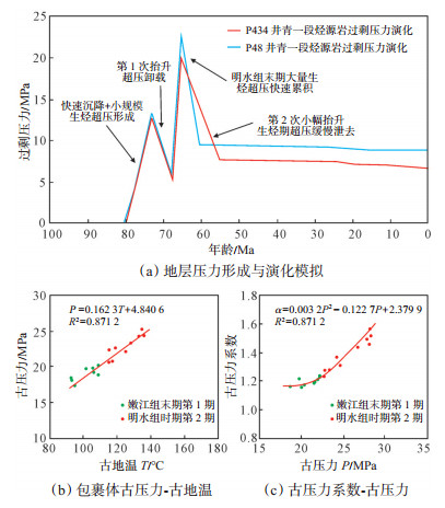 研究区泉四段为典型的“源下型”致密油,由古龙凹陷青一段烃源岩生烃增压形成的超压是油气克服自身浮力、致密储层毛细管力向下“倒灌”的主要动力[23-24]。研究区P48井和P434井单井埋藏史和热史模拟表明,嫩江组沉积时期青一段烃源岩达到生烃门限并开始生烃,在青一段内部形成12.65~14.82 MPa的超压,略早于油气大规模充注,但该时期超压随盆地抬升而迅速卸载(图 8a);明水组沉积末期烃源岩大规模成熟,形成19.6~23.5 MPa的超压,是青一段油气向下倒灌进入泉四段储层和致密油充注成藏的重要动力[25]。应用PVT simulation技术估算包裹体最小捕获压力表明,古压力与古温度呈良好的正相关关系,嫩江组沉积末期第1期油气充注,地层压力为16.50~20.60 MPa(图 8b),对应的压力系数为1.08~1.23,地层超压较小;明水组沉积时期第2期油气充注,地层压力为2 0.80~25.30 MPa,大部分样品压力系数大于1.20,为1.25~1.52,最高达1.58(图 8c),表明该时期存在超压流体活动,这为油气向外大规模排烃创造了有利条件。