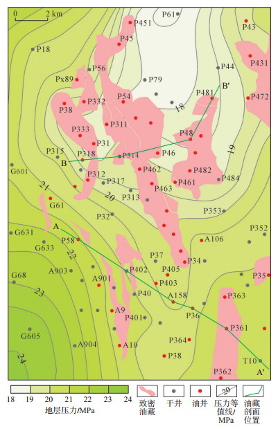 物性测试表明,泉四段储层排驱压力一般小于5.00 MPa,由青一段生烃增压形成了19.60~23.50 MPa的超压,在克服了2.40~2.70 MPa的浮力、3.70~8.20 MPa的运移阻力和0.30~0.50 MPa的静水柱压力后,油气下排深度可达100~500 m,为大面积致密油的形成创造了有利条件。测井和地层实测压力表明,葡萄花油田青一段地层压力差异较大,为17.00~24.00 MPa,而其西部古龙凹陷偏离正常压力,超压发育,向东随埋藏深度减小、压力迅速降低。平面上,泉四段致密油含油面积与超压分布存在明显的对应关系,致密油分布区地层压力偏高,为18.00~22.00 MPa,油藏围绕北部P61井、P79井低压区呈环带状展布(图 9)。