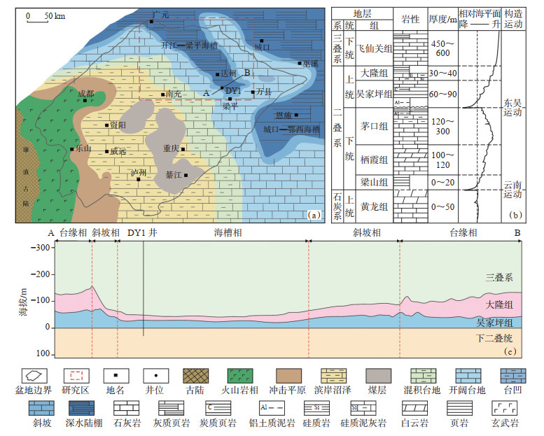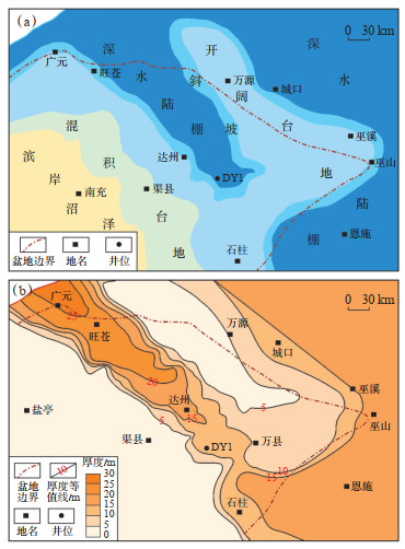 1 地质概况二叠纪末—三叠纪初,受勉略洋扩张和峨眉地裂运动的影响,四川盆地北部处于伸展、拉张应力环境,在不同程度上影响了茅口组—大隆组/长兴组的沉积建造[8]。此时扬子陆块整体均为陆表海环境,沉积岩相以台地相碳酸盐岩为主,往深海方向沉积页岩相(图 1a)。吴家坪组沉积时期,盆地内形成峨眉山玄武岩、川西南陆相宣威组、川中—川南海陆过渡相龙潭组、川北—川东海相吴家坪组的同期异相沉积,岩性自南向北依次为火山岩、陆相碎屑岩、过渡相含煤碎屑岩、海相碳酸盐岩及硅质页岩;在长兴期盆地内形成碳酸盐岩台地及台缘斜坡相长兴组、深水陆棚相大隆组的同期异相沉积,前者主要发育厚度为80~300 m不等的碳酸盐岩沉积(图 1b),在开江—梁平海槽两侧及川中、川南地区广泛分布,后者仅分布在开江—梁平海槽深水沉积区,岩性以灰黑色薄层硅质岩夹页岩为主,盆缘及盆外同期地层受城口—鄂西海槽控制。