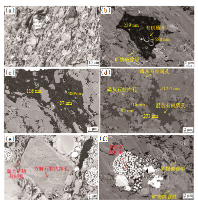3.2 储集空间成因机制 3.2.1 原始孔隙组成页岩的孔隙演化经历了原始沉积作用和后生成岩改造作用2个阶段,主要讨论原始沉积阶段形成高孔隙的条件,即有机质、矿物组成等物质组分与高孔隙的关系。吴三段地层沉积期,槽内远离物源、欠补偿深水和火山物质输入的沉积条件决定了二叠系页岩富硅富碳的特征,在与龙马溪组相同埋深及成熟度条件的页岩相比,吴家坪组保存了现今高有机质、高孔隙度、多孔隙类型的页岩。吴三段页岩有机质孔发育,无机质孔欠发育,扫描电镜下干酪根常与片状黏土矿物混合,在热演化过程中形成长条状有机孔,油裂解形成的沥青充填在矿物粒间孔和裂缝中。吴三段形成的有机质孔占比达到80%,孔径在几纳米和数百纳米均有发育,以1~100 nm为主,发育少量200 nm的孔隙(图 10a—10c);无机质孔主要为粒内溶蚀孔和矿物粒间孔,以100~500 nm为主,多处可见1~2 μm孔隙。粒间孔主要发育方解石矿物边缘与表面、黏土矿物片间孔隙,以及磷灰石、黄铁矿发育的大量粒间孔(图 10d),除方解石表面的溶蚀孔(图 10e),黄铁矿内还可见矿物颗粒溶蚀形成的铸模孔(图 10f)。此外,吴三段页岩微裂隙空间也较发育,宽数十纳米至数微米,具有较好的延伸性和开放性,矿物中的微裂缝、矿物边缘的差异收缩缝和破碎带缝等共同形成连通性较好的气体储集空间。