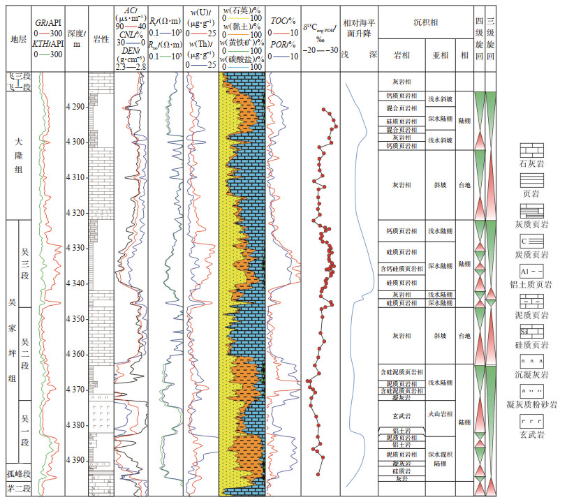 根据岩石组成、电性特征将吴家坪组自下而上分为3段(表 1、图 2)。下部吴一段为王坡页岩段,主要为凝灰质砂质泥岩夹泥质砂岩,与上部玄武岩共同组成吴一段岩性(图 3a—3d)。茅口组沉积结束后,全区抬升进入暴露环境,沉积吴家坪组一段王坡页岩,DY1井岩性主要为凝灰质砂质泥岩夹黑灰色页岩、泥质砂岩和砾岩,上部为玄武岩与薄层凝灰岩,岩性组合复杂。王坡页岩作为上二叠统底界标志层,在盆地内广泛发育。薄片下见铝土质页岩、页岩、铝土岩的层内分布大量高等植物碎片,δ13Corg值升高,判断该套页岩发育在潟湖-沼泽相环境中,且页岩中有外生有机质的混入。吴二段为炭质页岩和浅水灰岩组合。王坡页岩沉积后,随着水体逐步加深,吴二段整体沉积环境由滨岸沼泽沉积向浅水陆棚相变化,下部为炭质页岩和页岩沉积(图 3e,3f),页岩内部发育互层状沉凝灰岩层,可能是峨眉山大火成岩省相关的酸性火山活动的产物。上部发育灰色粉晶灰岩、泥晶生屑灰岩(图 3g,3h),局部夹薄层泥岩或页岩。吴二段页岩以高有机碳含量为特征,但页岩中高黏土低硅质含量反映这一时期仍具有明显过渡相页岩特征,页岩段δ13Corg值具有小幅升高特征,除外源有机质输入因素,这一时期页岩中δ13Corg含量反应岩层受玄武岩和凝灰岩沉积的热蚀变作用影响[15]。吴三段主要为黑色硅质页岩,夹少量深水灰岩(图 3i—3l)。大规模海侵前,小规模水体加深形成了吴三段下部黑色页岩,随后海槽两侧斜坡滑塌沉积了深水灰岩夹层,经历小规模变浅后,硅质页岩薄片下可见放射虫,海侵形成的深水陆棚相,海洋浮游生物的大量死亡堆积,形成δ13Corg值整体负漂的现象;上部为灰黑色泥质灰岩、灰质白云岩、含灰质页岩夹层和灰岩夹层,厚度为7.60 m,反映出水体开始动荡,水动力增强。上部大隆组为灰质页岩-页岩-灰质组合,是吴家坪海退后新一期海侵沉积产物。