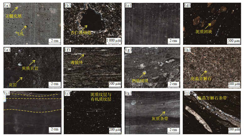 下载原图 图 3 四川盆地开江—梁平海槽上二叠统海相页岩岩石类型及特征 (a)上部玄武岩岩心特征,4 373.00 m,吴一段;(b)上部玄武岩薄片特征,4 373.00 m,吴一段;(c)下部泥岩岩心特征,4 380.24 m,吴一段;(d)下部泥岩薄片特征,4 380.24 m,吴一段;(e)下部页岩岩心特征,4 366.05 m,吴二段;(f)下部页岩薄片特征,4 366.05 m,吴二段;(g)上部灰岩岩心特征,4 348.70 m,吴二段;(h)上部灰岩薄片特征,4 348.70 m,吴二段;(i)黑色页岩岩心特征,4 336.70 m,吴三段;(j)黑色页岩薄片特征,4 336.70 m,吴三段;(k)底部灰岩岩心特征,4 339.56 m,吴三段;(l)底部灰岩薄片特征,4 339.56 m,吴三段。 Fig. 3 Lithologic association types and characteristics of Upper Permian marine shale of Kaijiang-Liangping trough in Sichuan Basin |
