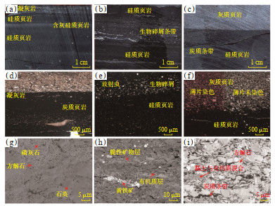 通过矿物成分分析认为,DY1井吴三段页岩主要发育硅质页岩,岩心多见生物碎屑条带、凝灰岩条带发育,部分岩心可见灰质条带(图 5a—5e),碳酸盐矿物质量分数平均为16.6%,硅质矿物质量分数平均为69.2%,黏土矿物质量分数为8.0%。凝灰岩条带附近黑色页岩内见磷灰石分布(图 5g),与炭质纹层共同发育;生屑条带内放射虫和双壳类生物多见,与无机矿物在镜下表现出良好的成层性(图 5h);灰质条带附近碳酸盐矿物粒径较大(图 5i),搭建起黏土矿物、有机质沉积的脆性矿物支撑格架。整体上吴三段页岩岩性纵向表现出较强的非均质性,且大多为同期沉积现象,表明优质页岩的富集主要是受控于沉积作用,以沉积水体及事件沉积的控制为主,部分位置可见水平缝被方解石流体充填,后期成岩流体改造作用暂不做讨论。