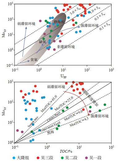下载原图 图 6 四川盆地开江—梁平海槽二叠系吴家坪组页岩MoEF-UEF协变模式、Mo-TOC关系图 Fig. 6 Relationship diagram of Mo-U covariant patterns relationship between Mo and TOC in shale of Permian Wujiaping Formation, Kaijiang-Liangping trough in Sichuan Basin |