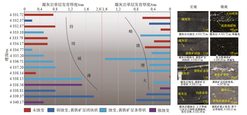 在二叠纪沉积过程中,同生断裂广泛存在,沿断裂带出现明显的岩性、岩相与沉积厚度差异,伴随着火山活动或重力流作用,造成特有的古地理面貌[20],这一时期火山活动主要产物是玄武岩喷溢及晚二叠世中的凝灰岩夹层[21]。研究区玄武岩主要分布在梁平附近,多见于吴一段,凝灰岩夹层在各段页岩中均有出现,在吴三段页岩中较为发育。吴三段页岩层中多见凝灰岩条带,部分蚀变为斑脱岩,沉凝灰岩发育,凝灰岩火山物质质量分数大于90%,是一种火山灰沉积后形成的蚀变程度较弱、具有凝灰结构的火山碎屑岩,沉凝灰岩是介于凝灰岩与陆源碎屑岩之间的类型,而斑脱岩则是火山物质在海水条件下发生水解、蚀变形成的黏土岩[22]。DY1井吴三段页岩取心段内观察到16期凝灰岩条带(图 7),其中2条蚀变严重已成为斑脱岩,矿物成分显示黏土质量分数大于30%,岩心上观察到条带与页岩明显分离,上下界面被后期流体侵入,形成钙质条带。几乎凝灰岩条带均发生黄铁矿化,仅个别条带内零星出现,多呈条带状或团块状,在扫描电镜下呈草莓状和团块状,凝灰岩条带内黄铁矿数目明显多于页岩层,其大量出现可能与火山喷出的含硫物质有关。