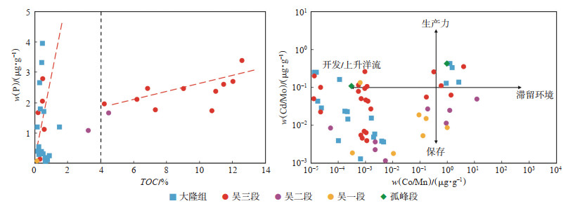 控制高有机质的核心条件是初级生产力,火山活动对初级生产力的主要作用途径是P元素,P元素作为水体中生物繁衍的必须营养元素,会随生物遗体沉降而转移到沉积物中,是古生产力的直接指标。大规模的火山活动产生的火山灰蚀变向水体输入大量磷酸盐,释放出许多对生物繁殖有益的元素,如Fe,P,Si等,作为生命元素,P的输入会增加表层水体的营养物质通量,大大提高低营养物限制海域的储集生产力,表现为与TOC呈正相关关系。Si和N元素会一起被放射虫利用,出现繁盛现象,Fe元素浓度会大幅促进生产力增加。