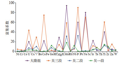 下载原图 图 9 四川盆地开江—梁平海槽二叠系页岩元素富集特征 Fig. 9 Element enrichment characteristics of Permian shale in Wujiaping Formation, Kaijiang-Liangping trough in Sichuan Basin |