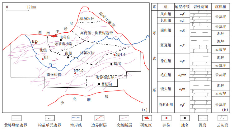 下载原图 图 1 渤海湾盆地唐海油田T180X2区块构造位置(a)和寒武系岩性地层综合柱状图(b) Fig. 1 Structural location (a) and stratigraphic column of Cambrian (b) in T180X2 Block of Tanghai Oilfield, Bohai Bay Basin |
