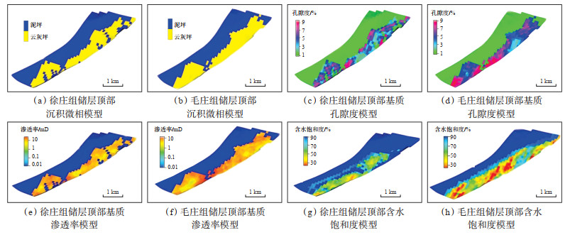 按照此方法建立研究区徐庄组和毛庄组的沉积相模型,沉积相主要包括云灰坪微相与泥坪微相,基质孔隙度为3.00%~9.00%,基质渗透率为1~10 mD,基质含水饱和度为20%~90%,均与前期认识一致,且基质孔隙度模型、基质渗透率模型及基质含水饱和度模型都表现出较好的相控特征。