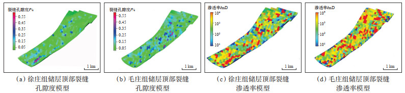 2.1.2 裂缝模型利用T180X2区块成像测井成果及地震方差体构建徐庄组和毛庄组碳酸盐岩储层的裂缝模型;再由裂缝模型生成各小层的裂缝强度模型,将裂缝强度模型粗化,生成相应的裂缝属性(孔隙度、渗透率)模型。模型结果(图 3)显示:毛庄组裂缝孔隙度(0.05%~0.55%)及裂缝渗透率(10~10 000 mD)均较徐庄组更大,与前期地质认识基本一致。