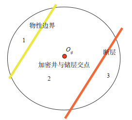 假设一口井钻遇N个储层,井轨迹与储层的交点中部坐标为Oij(I,J,K),以该交点为中心,对半径为R的球体范围内所有网格剩余油进行累加,即为单井控制可动剩余油量。将砂体被断层、岩性及储层物性变化等非渗流屏障划分的规模更小的独立砂体定义为储量单元,基于精细油藏描述及试井成果,可识别出每套储层的非渗流屏障,即可精准地划分储量单元。在计算单井控制范围内的可动剩余油时,所累加的剩余油网格必须与Oij为同一个储量单元,否则必须舍弃。以一个半径为R的球形砂体为例(图 5),区域被物性边界及断层划分成3个独立的储量单元,分别命名为1,2,3,井轨迹与砂体的交点Oij处于储量单元2中,则该井在这套砂体上的可动剩余油量为储量单元2的剩余油量,而非整个区域剩余油量。