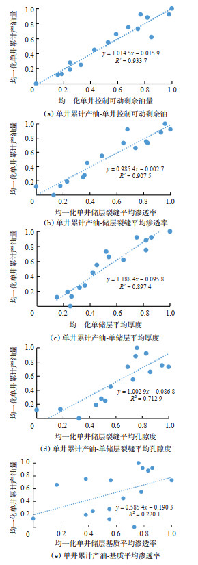 将5个影响因素均一化后分别与单井累计产油量进行拟合,结果(图 6)显示:与单井累计产油量的相关性由高到低影响因素为单井控制可动剩余油量,储层裂缝平均渗透率,单储层平均厚度,储层裂缝平均孔隙度,基质平均渗透率;基质平均渗透率与单井累计产油量的相关性较低,这一结论说明裂缝是裂缝-孔隙型碳酸盐岩油藏的主要渗流通道与前期地质认识及开发动态特征相吻合。