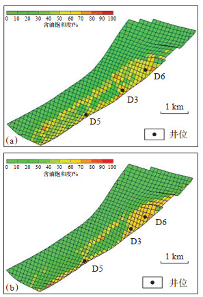 利用综合“甜点”系数优选靶点及相关的井轨迹,从10口设计井中优选出综合“甜点”系数值最大的D6,D3及D5井进行投产,这3口井的靶点均靠近边界断层,且分布在剩余油相对富集部位,毛庄组储层顶部剩余油较徐庄组更大(表 5,图 8)。