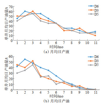 D6,D3和D5井均于2021年3月2日投产,生产至2022年1月末综合含水率都上升至99.0%,达到油井停产标准,生产时间均为11个月,3口井全生命周期累产油20 800 t,整体上获得了较高的经济效益,也体现出裂缝-孔隙型碳酸盐岩油气藏初期产量高,但递减快的特征(表 6,图 9)。利用改进层次分析法计算的D6,D3和D5井的综合“甜点”系数依次为0.95,0.77和0.72,而单井全生命周期累产油量分别为8 300 t,6 700 t,5 800 t,二者表现出较高的正相关性,而采用常规层次分析法计算3口井的综合“甜点”系数分别为0.93,0.72,0.76,其中D3井的综合“甜点”系数高于D5井,但实际累计产油量更低。