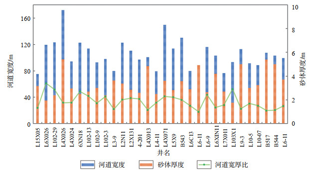 下载原图 图 11 东营凹陷林樊家油田林东地区Ng4-7-1单层河道规模参数统计 Fig. 11 Statistics of channel scale parameters for single layer Ng4-7-1 in Lindong area of Linfanjia Oilfield, Dongying Sag |