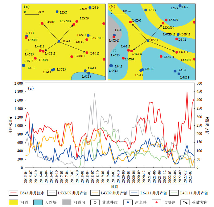 5 生产动态验证 5.1 油水井动态分析为验证构型解剖精度,选取林樊家油田林东地区B543井组开展注采动态分析结果(图 13)显示,该井组在Ng4-7小层全层射孔,初始未细分单层时注采响应与沉积微相匹配度低,表现为小层相图显示该井组位于同一条河道,但是注采曲线显示差异明显,而将该小层细分为Ng4-7-1单层、Ng4-7-2单层后,Ng4-7-2单层注采曲线与微相分布相吻合,表现为3口受效井在Ng4-7-2单层的相图中与B543井位于同一条河道。动态特征显示,2015年4月对注水井B543进行注水,2015年8月3口监测井受效,其中L6-111井与L4X09井受效明显,L4C111井受效滞后,指示储层非均质性强;L6-111井、L4X09井与注水井的Ng4-7-2单层均发育单一河道砂体且沿NW—SE物源方向展布,说明水驱优势方向与古水流一致,渗透率梯度促进高效驱替;对Ng4-7小层细分单层后Ng4-7-2单层砂体连通性明显改善,证实了垂向分期-侧向划界方法的可靠性。