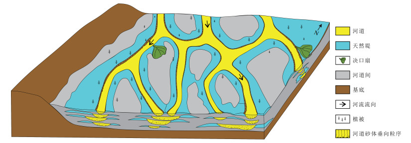 研究区L6-9井砂岩粒度分析结果(图 2a)显示,概率曲线呈两段式,颗粒质量分数50% 处所对应的Φ值为1.7~3.6。C—M图中C∈[130, 700]显区,M∈[70, 300]显区主要为QRS段,QR段基本与C—M线平行(图 2b),指示弱水动力环境,符合网状河沉积机制。研究区主力小层泥岩质量分数为63.2%~70.1%,河道宽厚比为25.5~51.1,高砂地比与河道分汊系数呈正相关,低宽厚比反映垂向叠置的“墙式”砂体沉积。测井曲线以薄层钟形为主,砂体内部夹层不发育。结合以往研究成果[24],最终确定研究区为网状河沉积,并将沉积微相划分为河道、天然堤、决口扇及河道间4种类型(图 3)。